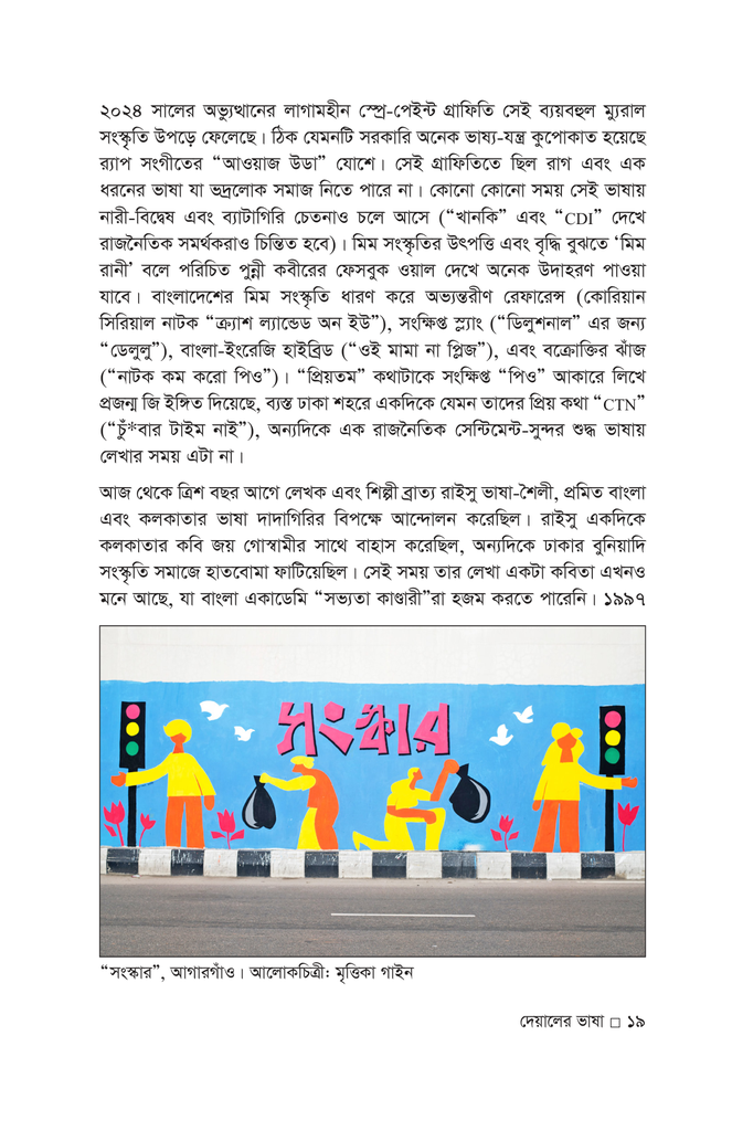 ‘দেয়ালের লিখন, বার বার খ-ন’ শিরোনামে নাঈম মোহায়মেনের লেখাটি দিয়েই এই সংখ্যার শুরু। যুদ্ধ, গণঅভ্যুত্থান, গণ আন্দোলন বা সামাজিক-সাংস্কৃতিক পরিবর্তনের প্রেক্ষাপটে গণমানুষের বিকল্প ছবি-ভাষা কীভাবে সত্য নির্মাণ করে; প্র্রাতিষ্ঠানিক ভাষা-ব্যাকরণকে পালটে দেয় এবং তার উপর চড়াও হয়, ভাষার শ্লীল-অশ্লীলের ভেদরেখাকে উপড়ে দিতে চায়-তার একটি দুর্দান্ত তাত্ত্বিক বিশ্লেষণ তিনি এই লেখায় করেছেন। পাশাপাশি জুলাই গণঅভ্যুত্থানের কিছু নির্বাচিত দেয়ালচিত্রের ন্যারেটিভও রয়েছে। শিবলী নোমানের লেখাটিতে গণঅভ্যুত্থানের সামাজিক বাস্তবতার বিশ্লেষণ ও দেয়ালচিত্র নিয়ে নাতিদীর্ঘ কিন্তু গুরুত্বপূর্ণ আলাপ রয়েছে। গণআন্দোলনে জনগণের সাংস্কৃতিক চর্চা ও তার বহিঃপ্রকাশের এক সম্মিলিত প্রয়াস দেশজুড়ে আঁকা গ্রাফিতি ও দেয়ালচিত্রগুলোতে ফুটে উঠেছে। সময়ের ব্যবধানে আন্দোলনের গণচরিত্র কিছুটা বদলে যেতে থাকলেও এই দেয়ালচিত্র ও গ্রাফিতিগুলোই শক্তিশালী উপাদান হিসেবে সকলের চোখের সামনে উপস্থিত।